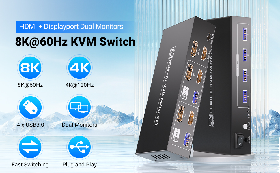 Are you tired of juggling multiple keyboards, mice, and monitors just to switch between 2 computers? Our 8K HDMI & DisplayPort 2 port KVM Switch is here to revolutionize your workspace.