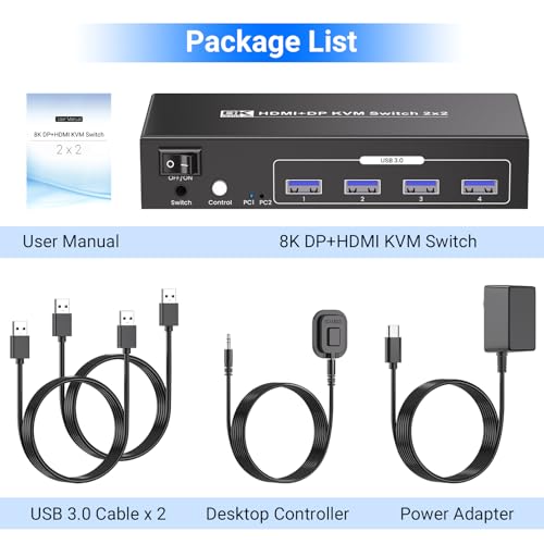 HDMI Displayport KVM Switch 2 Monitors 2 Computers, 8K60Hz 4K120Hz USB 3.0 Dual Monitor HDMI DP KVM Switch for 2 PCs Management Via 1 Set of Keyboard, Mouse and 2 Monitors