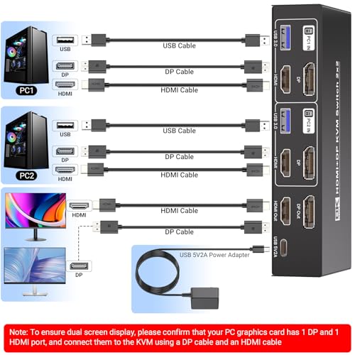 3. Please confirm that the graphics card of your 2 PCs has 1 DP and 1 HDMI output ports, and connect both to this KVM switch for each computer to ensure dual-monitor magic. Skipping one port? Only one screen will work.