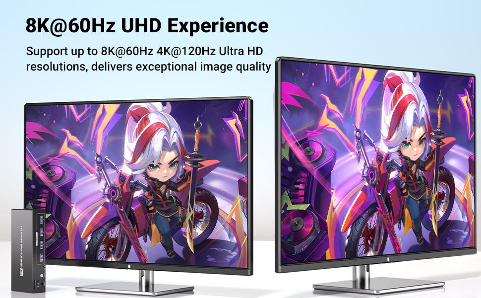 - 【8K Ultra – High – Definition Resolution】This dual monitor KVM switch supports resolutions up to 8K (7680 x 4320) @ 60Hz and 4K @ 120Hz. Whether you’re editing high – resolution videos, designing intricate graphics, or gaming in ultra – high – definition, every detail will be crystal – clear.