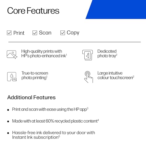 - EFFORTLESS PRINTS, ENDLESS POSSIBILITIES: Smoothly navigate printing with a large intuitive printer color touchscreen. With a dedicated photo tray, easily go from printing photos to everyday documents without switching paper. Effortlessly set up, print, scan and copy from your phone or laptop with HP's best and easiest-to-use Print App.