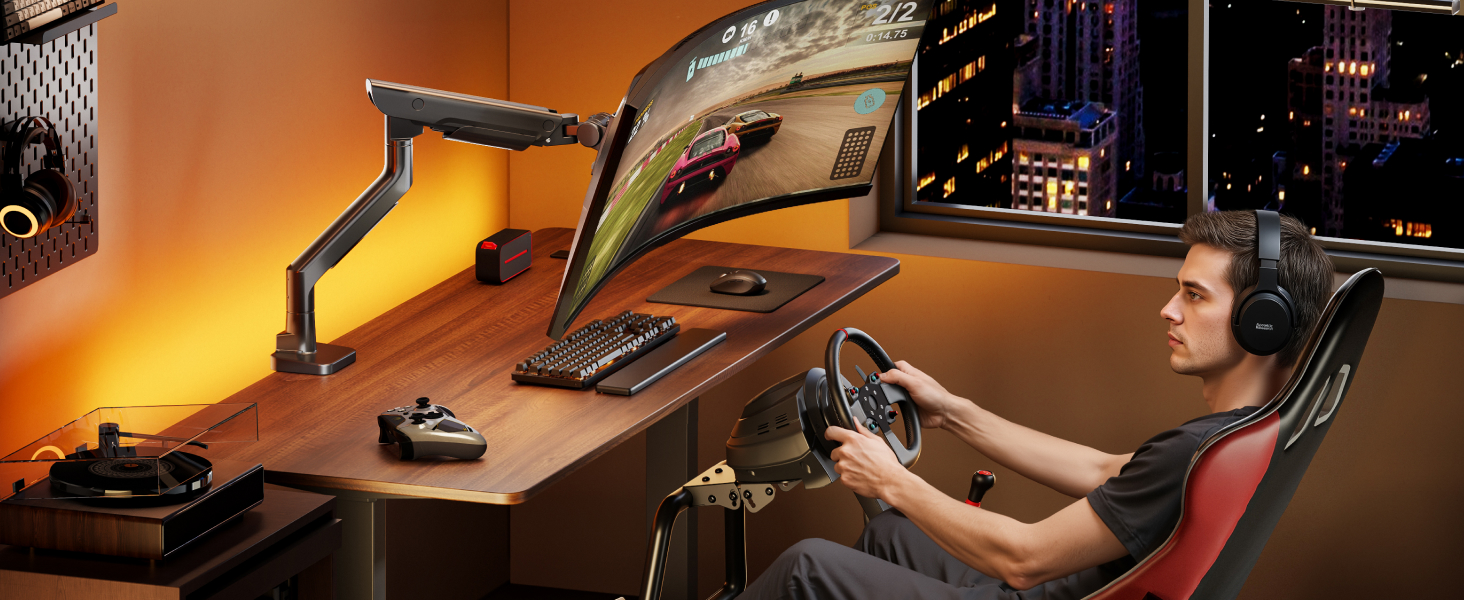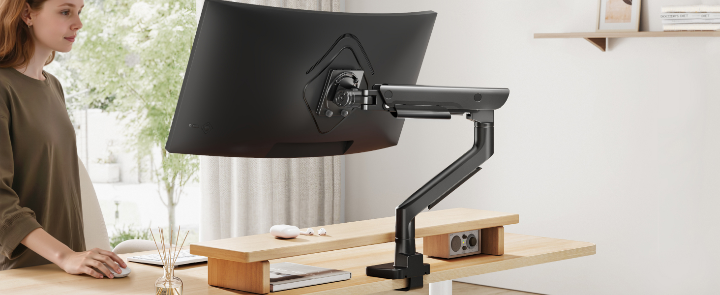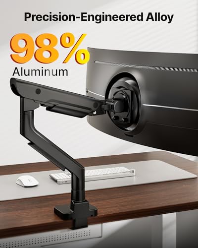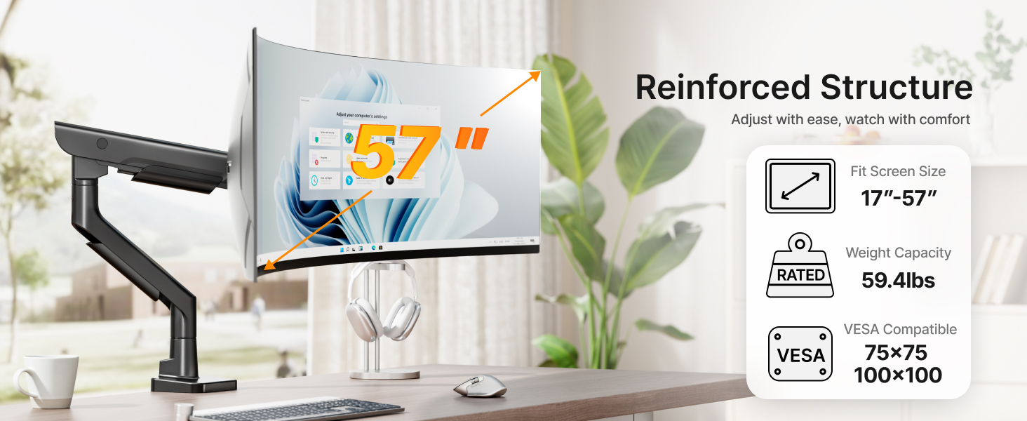 - 【Ultra-Stable Support up to 59.4 lbs & 57” Displays】Supports monitors from 17" to 57" and up to 59.4 lbs, including ultrawide and curved displays. Compatible with both 75x75mm and 100x100mm VESA mounting patterns, this arm ensures a rock-solid hold and flexible adjustment for even the largest screens in your setup.