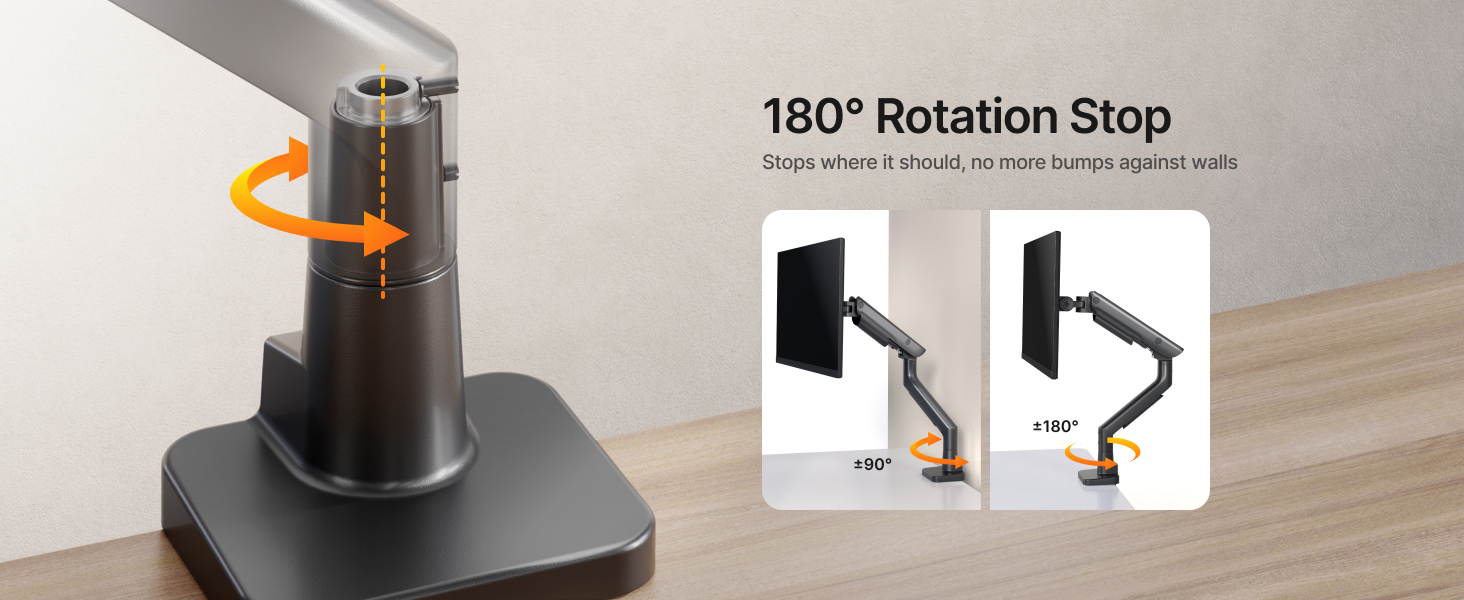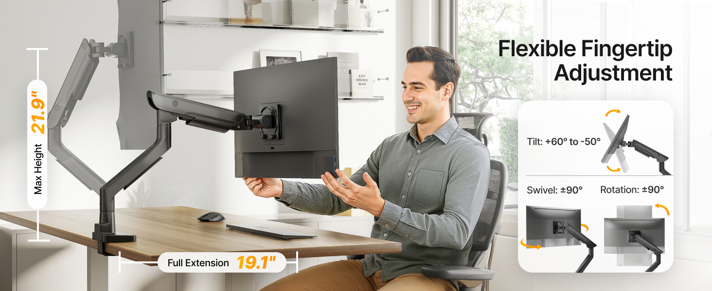 - 【Ultra-Wide Flexible Adjustment】Enjoy effortless ergonomic tuning with tilt from +60° to -50°, ±90° swivel, and ±90° rotation. The upgraded one-way bearing head structure enables smoother motion and precise control. Extend the arm up to 19.1” or lift it to a max height of 21.9” with ease.
