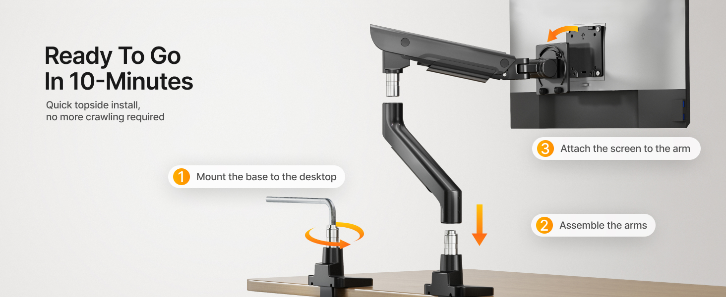 - 【Quick 10-Min Assembly – No Crawling Under Desk】Install in just 10 minutes using the topside-mounted C-clamp or grommet—no need to reach under your desk. Features a tool-free quick-release VESA plate and detachable arm joint for a streamlined setup. Fits desks from 0.47" to 1.8" thick.