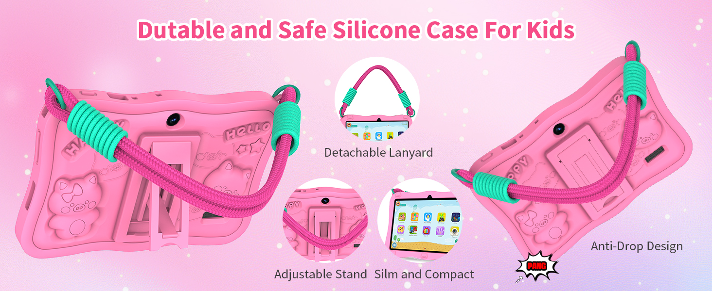 - [DURABLE CASE WITH LANYARD & STAND] – Includes a lightweight, shock-absorbent silicone case that protects against drops, scratches, and everyday bumps. The versatile case features a built-in stand for hands-free viewing and a detachable lanyard for easy carrying. Perfect for home or on-the-go learning and fun.