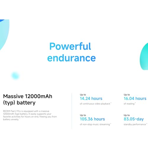 - [Massive 12000mAh (typ) battery] REDMI Pad 2 Pro is equipped with a massive 12000mAh (typ) battery. lt easily supports your favorite activities for hours on end, freeing you from battery anxiety