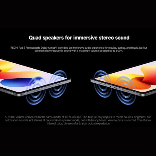 - [Immersive stereo sound] REDMI Pad 2 Pro supports Dolby Atmos, providing an immersive audio experience for movies, games, and music. lts four speakers deliver powerful sound with a maximum volume boosted up to 300%