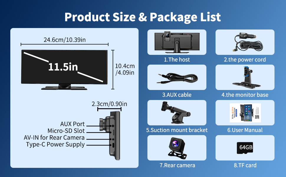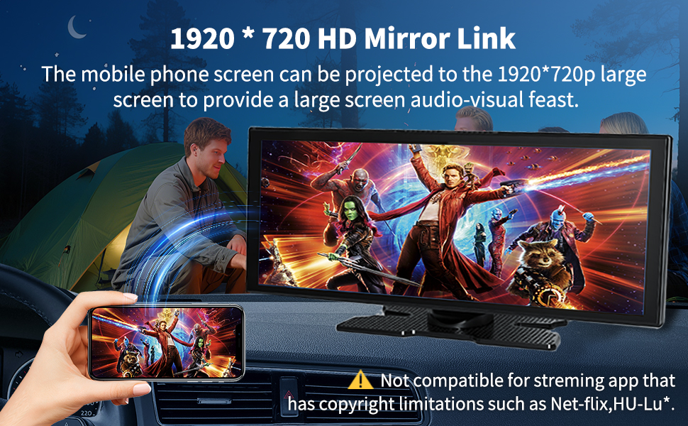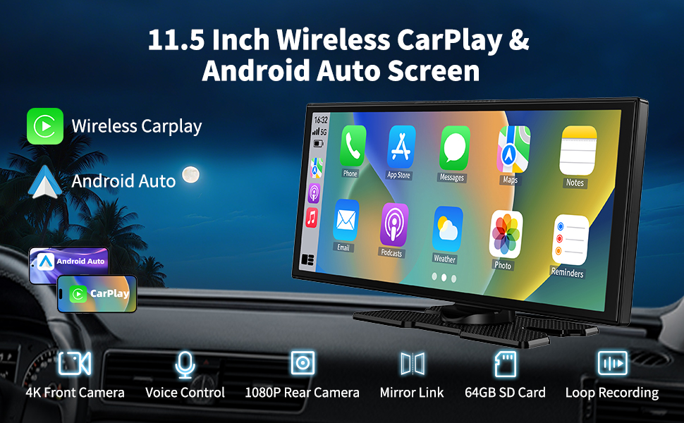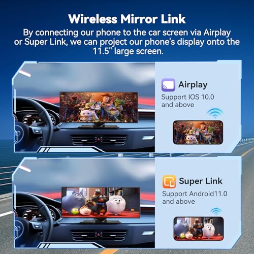 - 【11.5-inch IPS Touchscreen & Mirror Link】The Android Auto screen features an 11.5-inch IPS HD touchscreen with fast response and no delay, offering 1920*720P HD resolution. By connecting your Android or iOS phone via WiFi using Airplay/Super Link, we can wirelessly mirror our phone screen and enjoy a visual and auditory feast offered by the car tablet pro max 2025
