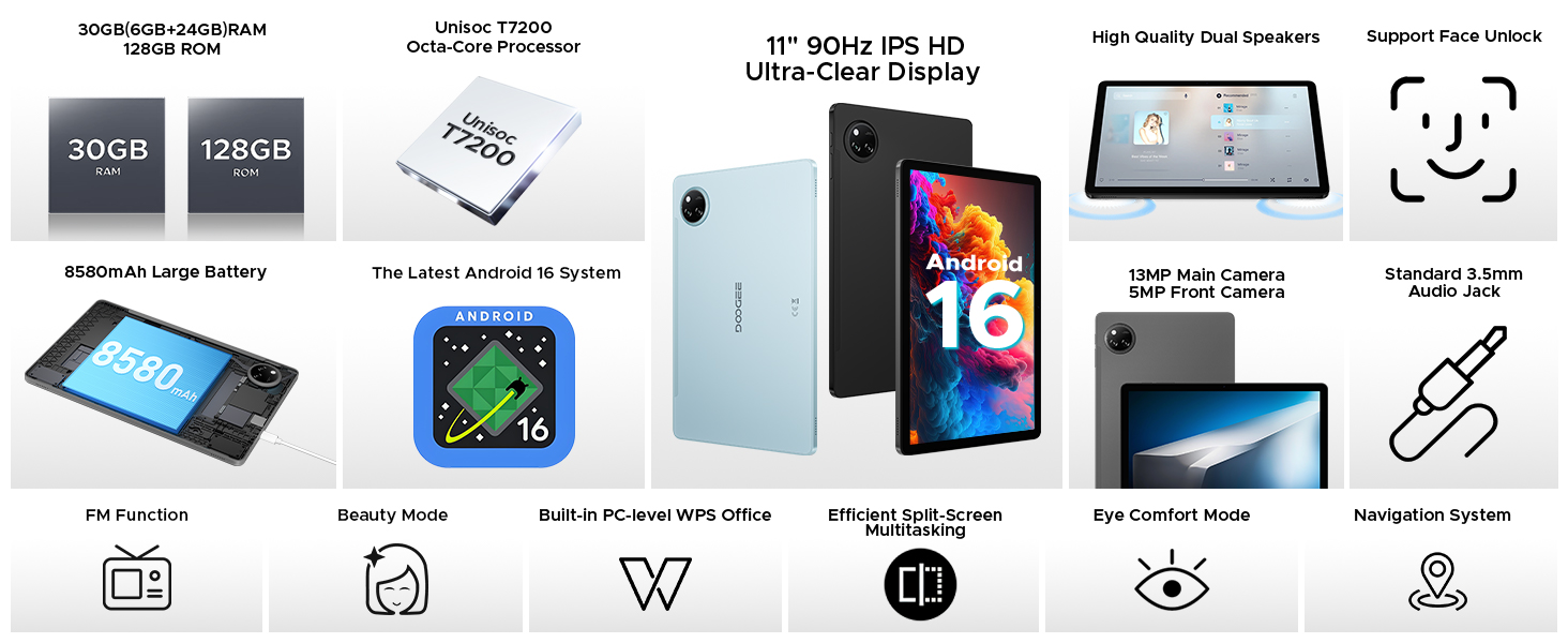 - ✈【30GB RAM Performance for Users】Imagine running 10+ Chrome tabs, a video call, and mobile game simultaneously without lag – that's the power of our DOOGEE Tab A9 Pro+ tablets ,which with 30GB RAM (6GB+24GB extended). This android tablets running Octa-Core processor delivers PC-like performance for graphic designers editing photos or gamers playing demanding titles. Store your entire digital life with 128GB ROM + 2TB expandable storage on this high-performance doogee tablet.