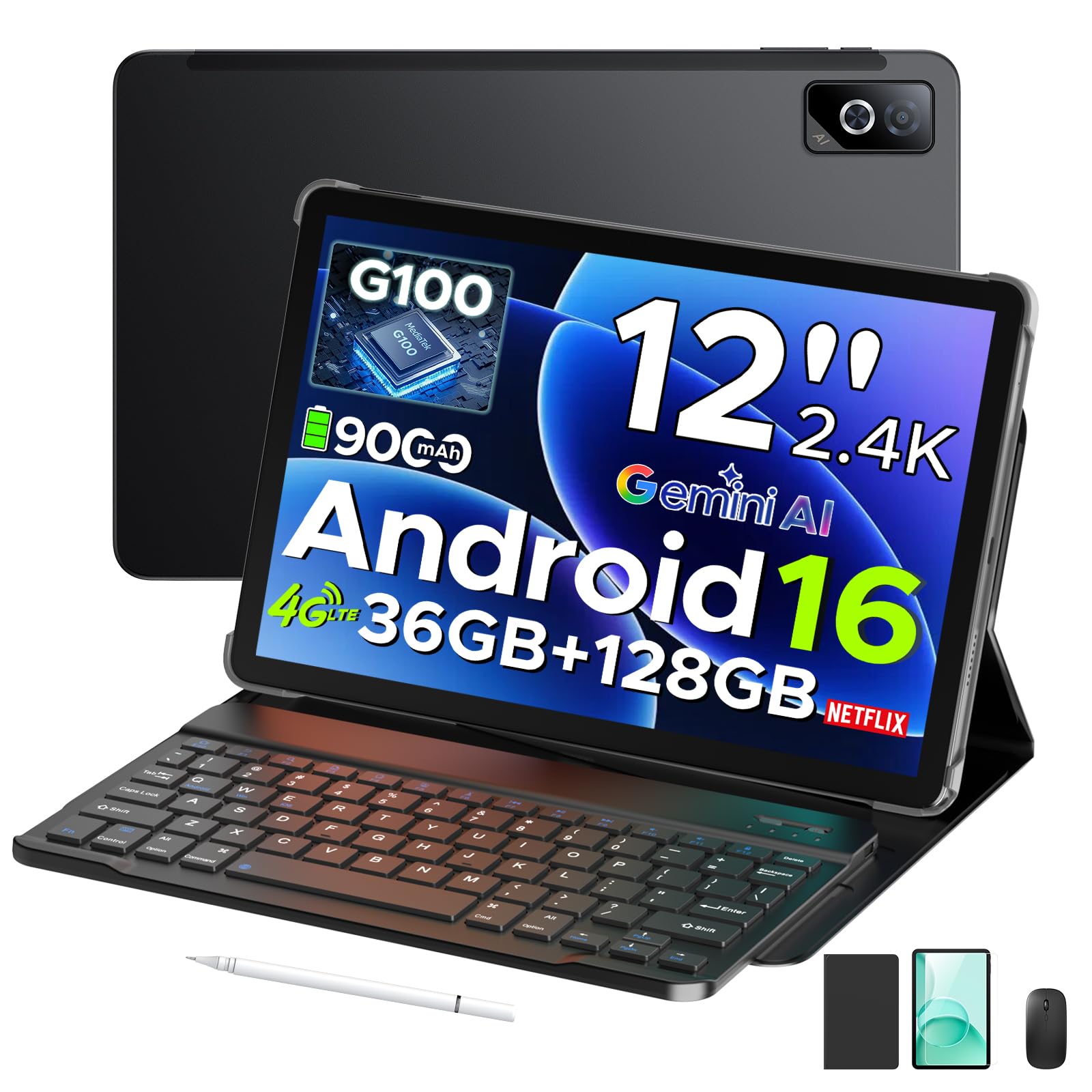 DOOGEE Tab G6 Pro 12 Inch 2.4K Tablet, 2026 Newest Android 16 Tablet with Keyboard, Helio G100, 36GB+128GB/2TB, 9000mAh Battery, 4G LTE/90Hz/Widevine L1/Gemini AI, Tablet with Pen, Mouse&Case, Black
