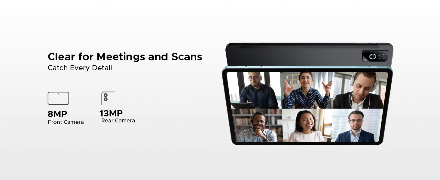 - 【13MP + 8MP Camera + Face Unlock】 The doogee tab g6 pro 12 inch tablet is eqiupped with dual camera system, 13MP main camera can captures documents, portraits, and landscapes in sharp detail, while the 8MP front AI camera ensures your selfies and video calls are always bright and clear, even in challenging light. You can access your tablet instantly and securely with Face Unlock, which responds to a simple glance. It combines fast convenience with reliable protection, making every interaction smooth and seamless.