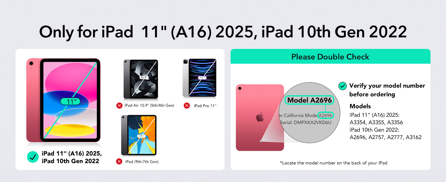 - Compatibility: only compatible with iPad 11" (A16) 2025/10th Gen 2022; models A2696, A2757, A2777, A3354, A3355, A3162, A3356