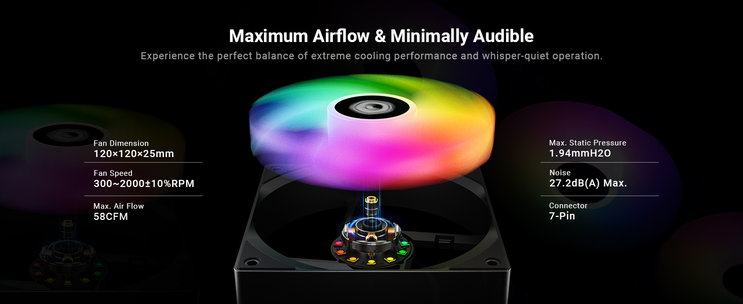 - 【Optimised Pump & Fans for Efficiency & Low Noise】The pump spins up to 2,900 RPM (±10%) with a ceramic bearing, while the included 3×120 mm AS-120-ARGB-V2 fans run from 300-2000 RPM (max 58 CFM, 1.94 mmH₂O) and reach as low as ~27 dB(A) noise under load.