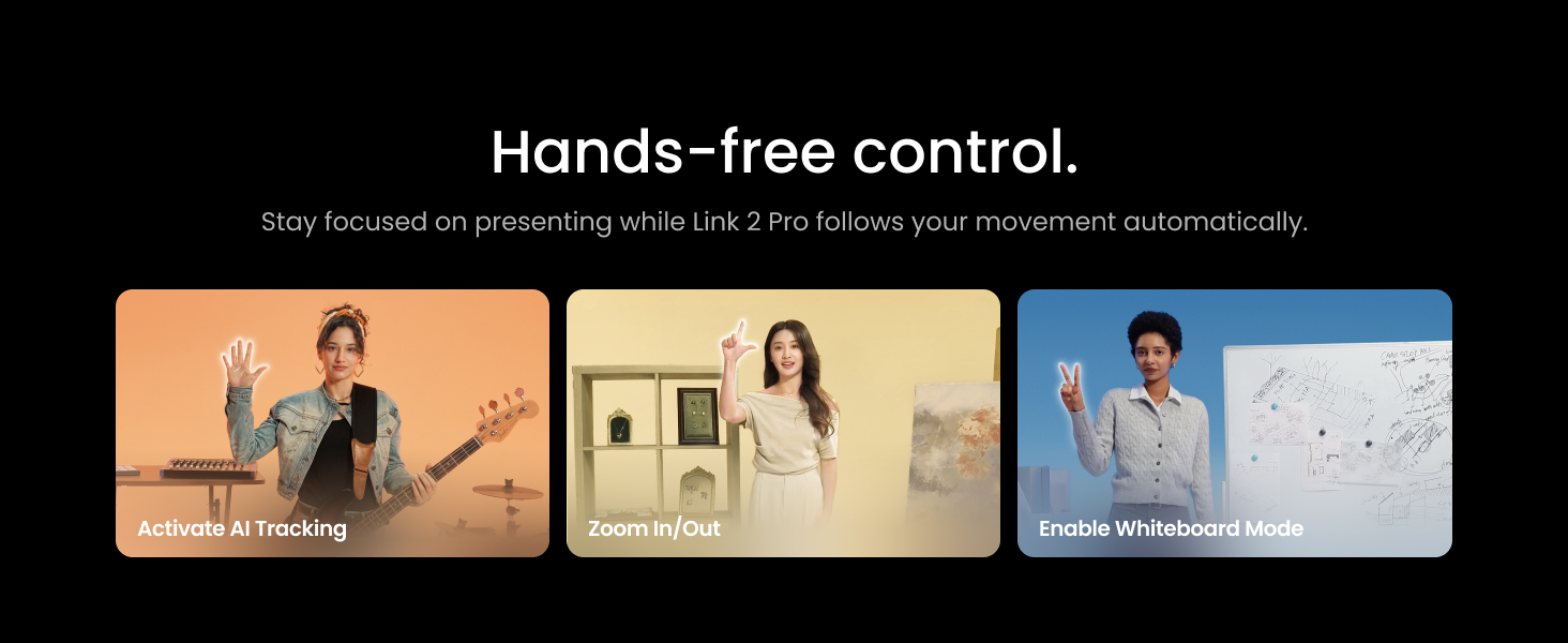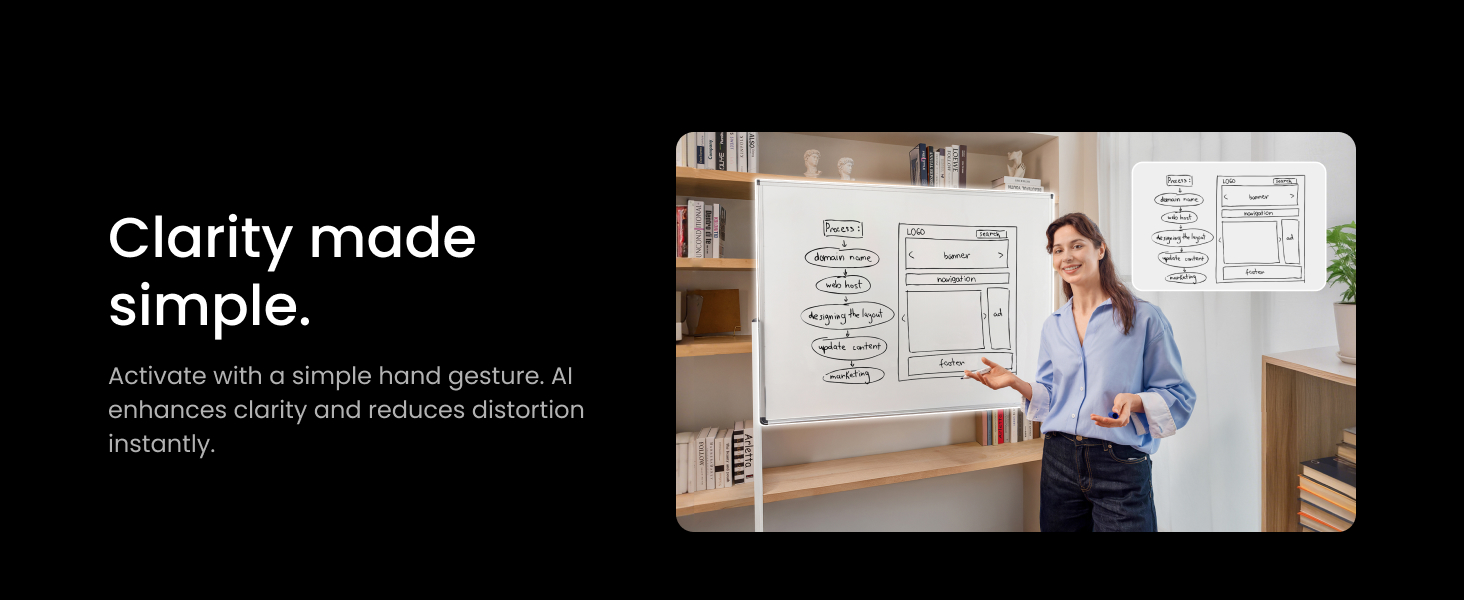 - Smart Gesture & Mobile Control: Start tracking, zoom, switch modes, or enable Whiteboard Mode using simple hand gestures (or your smartphone).