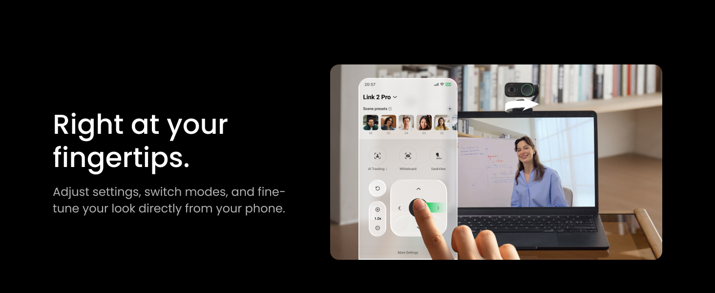- Gesture & Remote Smartphone Control: Control your webcam remotely from your smartphone, or use simple hand gestures to start AI Tracking/Auto Framing, zoom in or out and activate Whiteboard Mode.