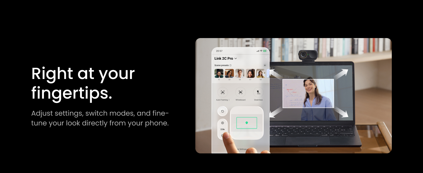 - Gesture & Remote Smartphone Control: Control your webcam remotely from your smartphone, or use simple hand gestures to start AI Tracking/Auto Framing, zoom in or out and activate Whiteboard Mode.