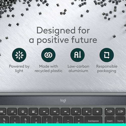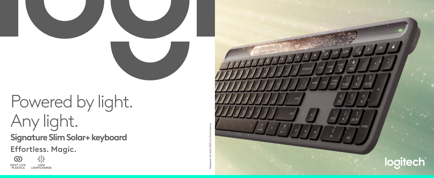 - Powered by Logi LightCharge – A charging innovation that combines a light-absorbing strip and a durable energy-efficient battery built on our Signature Slim Solar+ keyboard