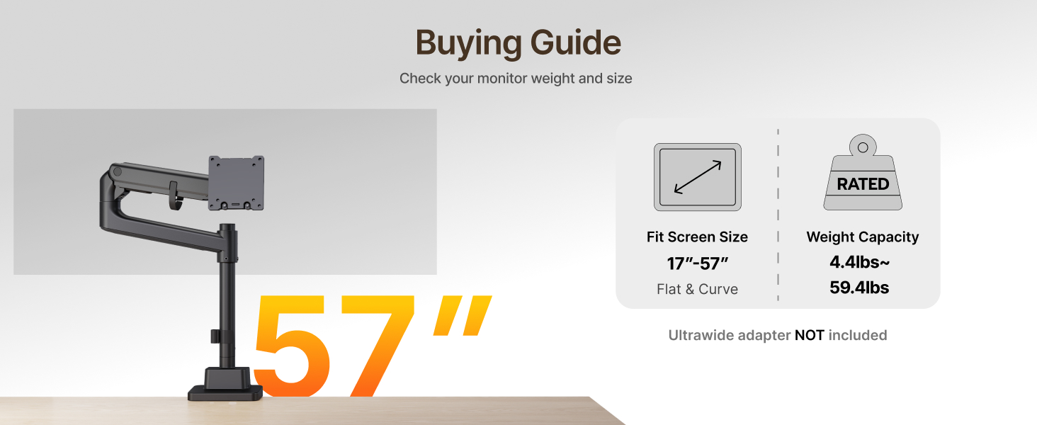 - 【Wide Compatibility & Rock-Solid Stability】Supports 17" to 57" curved and flat monitors with standard VESA patterns (75x75mm and 100x100mm). Constructed from heavy-duty aluminium, this arm ensures outstanding stability and has passed over 20,000 stress test cycles for proven durability.