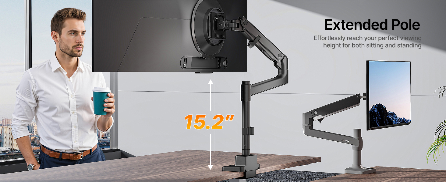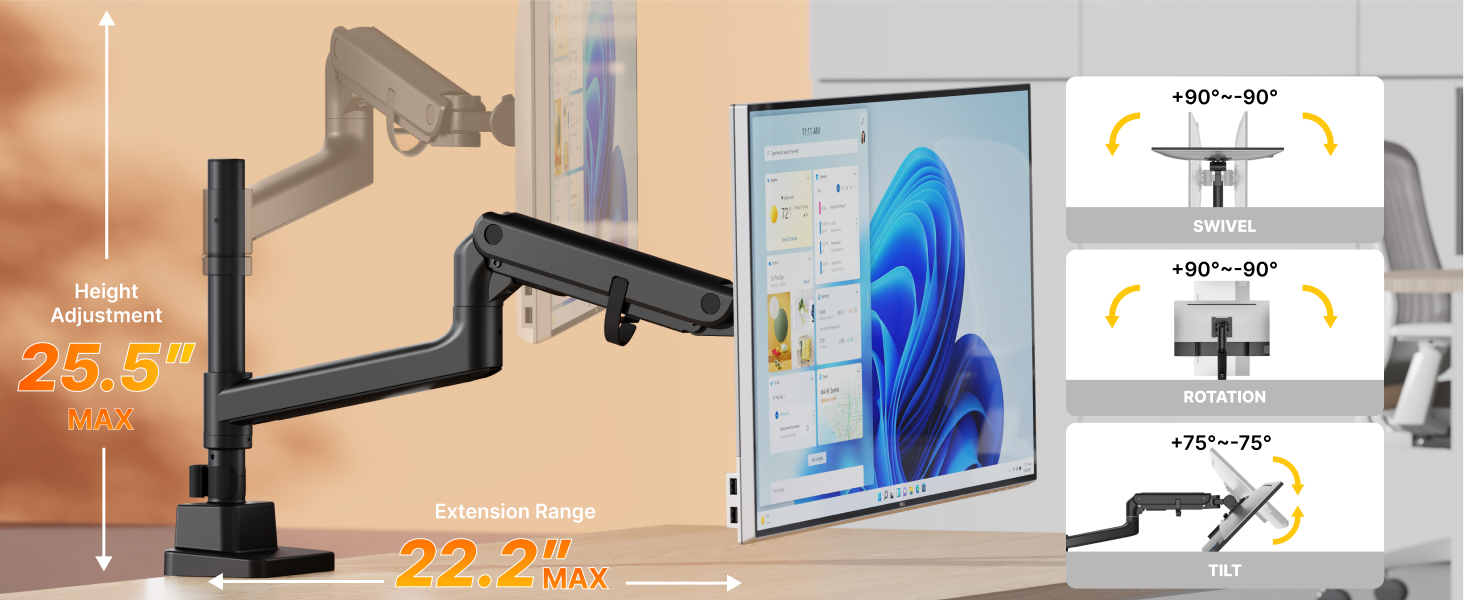 - 【Ergonomic Flexibility for Optimal Comfort】Enjoy full ergonomic adjustability with -75° to +75° tilt, ±90° swivel, and ±90° screen rotation. The 39 cm pole height adjustment and 65 cm arm height range, along with up to 56.5 cm extension, allow for ideal positioning—whether you're working, designing, or gaming.