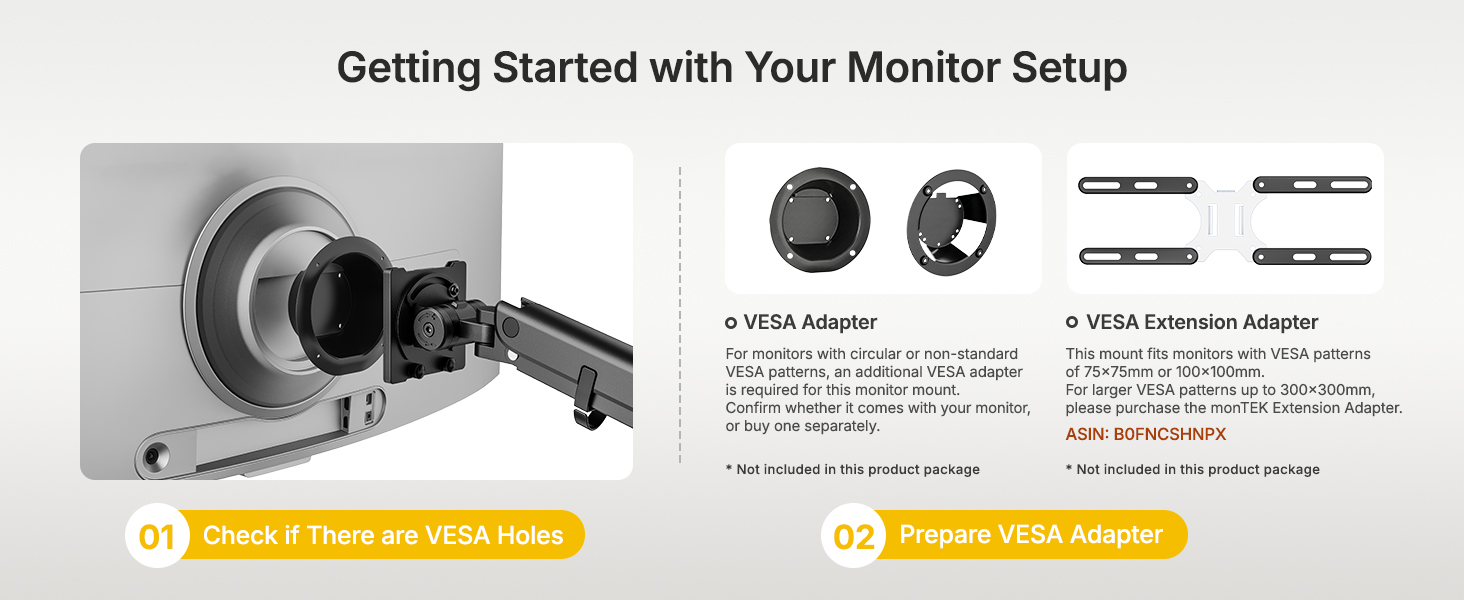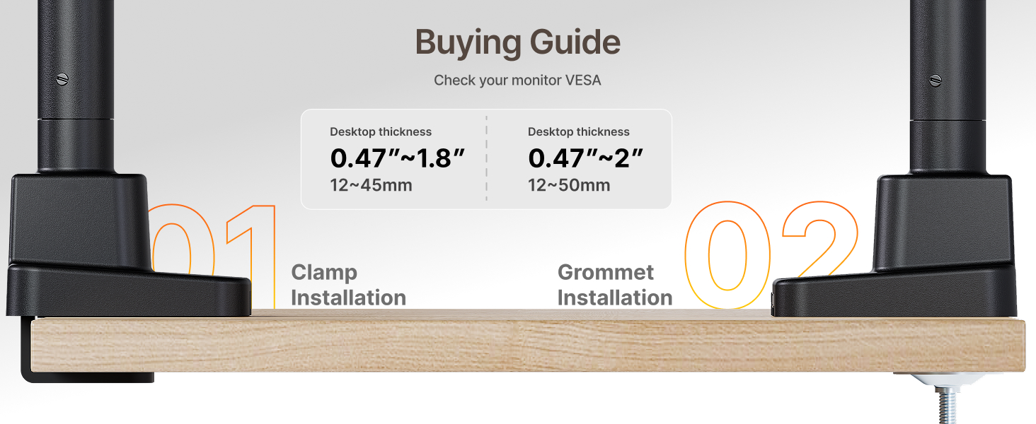 - 【Easy Installation】Choose from C-clamp or grommet base mounting options to suit your desk setup. The quick-release VESA plate makes attaching your monitor straightforward, while clearly marked parts help reduce installation time and effort.