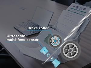 Paper feeds smoothly with a brake roller separation system. Special sensor stops multi-feeds so you don’t miss a page. Skew detection prevents damage.