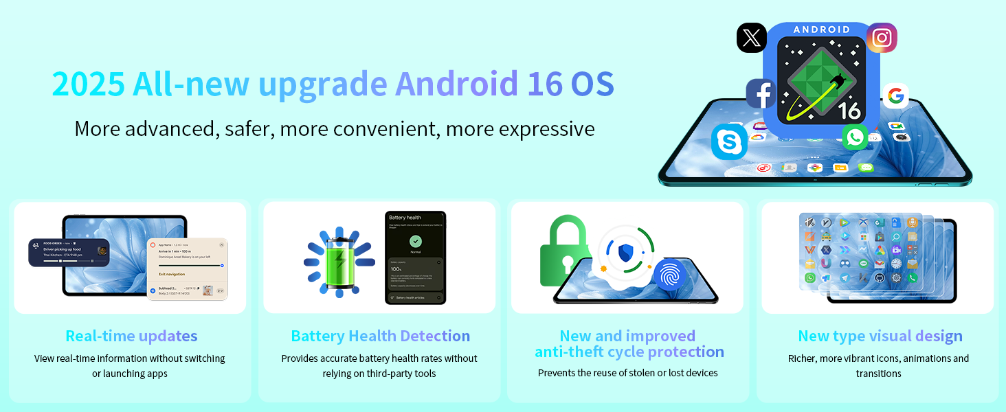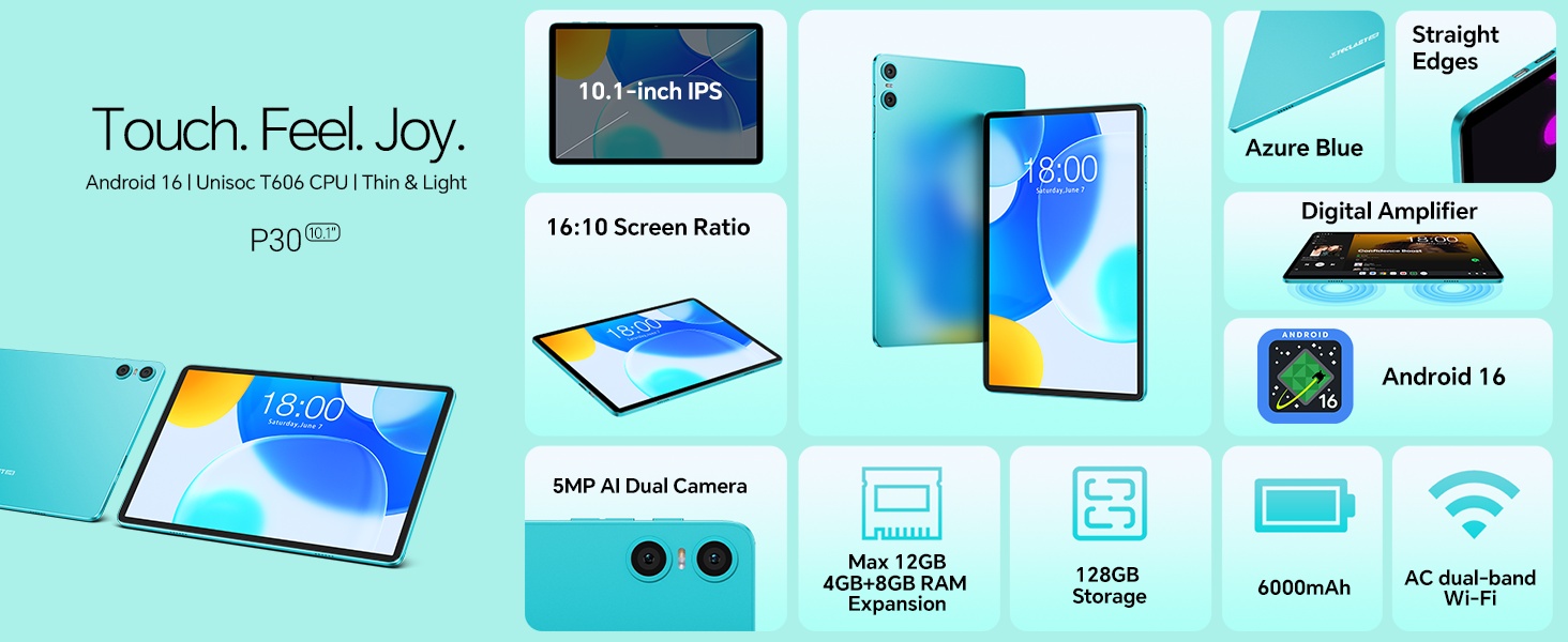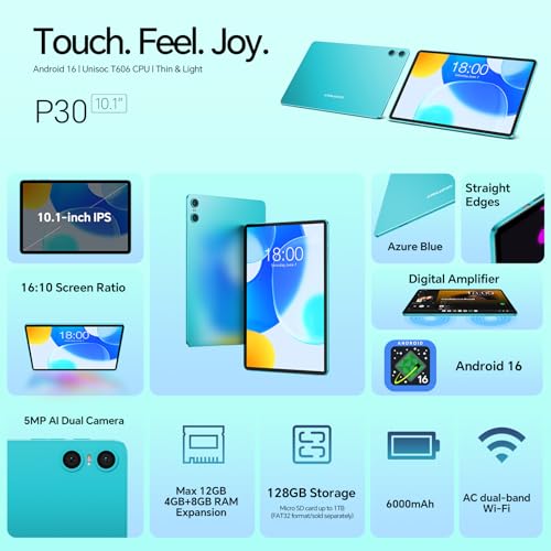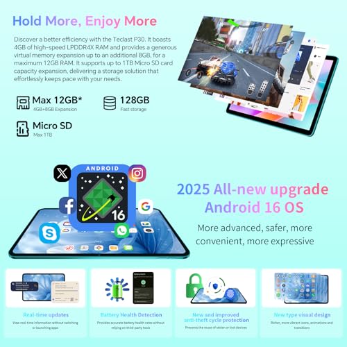 - ✅【Tablet Android 16+ Octa-Core Processor】The P30 Tablet is equipped with the latest Android 16 operating system (GMS certification), smoother and faster mode, offering more control over privacy and data. Smarter Ai optimisation, new features such as new gesture touch mode, global dark mode, make your tablet more personalised. The tablet is equipped with the T7200 A75 CPU, a Mali-G57 GPU, offering excellent performance for work and play.
