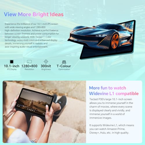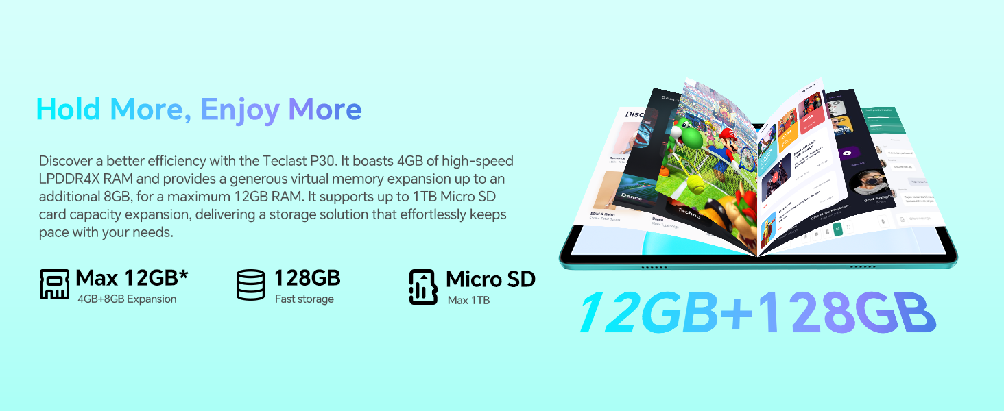- ✅【12GB RAM + 128GB ROM + 1TB Expandable Tablet】TECLAST P30 Tablet 10 inch with 12GB RAM (4GB LPDDR4 + 8GB expandable memory) and 128GB ROM. Micro SD allows memory expansion up to 1TB to deliver an exceptional multitasking experience. 128GB of high-speed ROM memory for storing large games and audiovisual works. Listening to music and watching videos can offer a more intense experience, as if you were there. You can enjoy stable services and favourite apps.