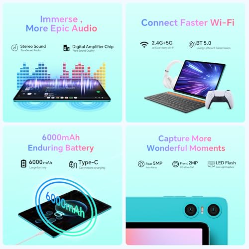 - ✅【Double Camera + Immersive Speakers + 2 Year Warranty】The Android tablets is equipped with HD camera, 5MP camera, to capture your precious moments and share with your friends in video conversations. Tablet equipped with dual speakers and intelligent amplification chip for even better sound quality. A 3.5mm audio jack interface has also been added to support headphone connection. 2-year warranty, if you have any questions, please do not hesitate to contact us.