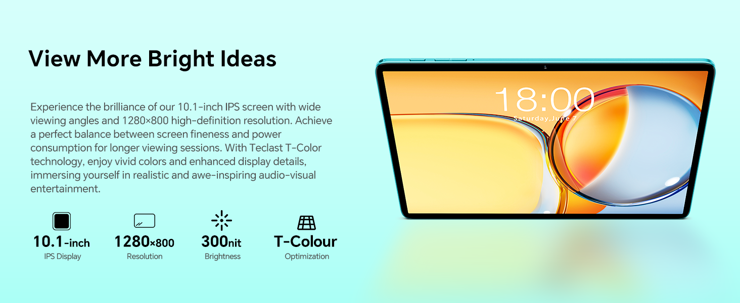 - ✅【10.1 inch Tablet + Light Body】This andorid 16 tablet with resolution 1280×800 IPS. T-colour 3.0 technologies for improved colour and image detail. The tablet using a 12nm process can effectively reduce heat generation while maintaining high performance. Uses a high-sensitivity G+G touch screen, a more precise touch experience.
