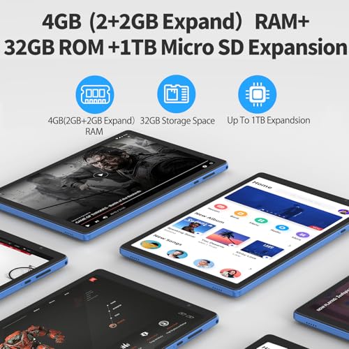 - 【Good Performance&Expandable Storage】Our android tablet is powered by a stable Quad-Core A133 processor clocked up to 1.6GHz. This enables faster app launches, smoother video playback, and overall superior performance. With 4GB(2+2GB Expand) of RAM and 32GB of internal storage (expandable up to 512GB with a TF card,do not included), you can run apps seamlessly and store an extensive collection of files, songs, pictures, videos, and games.