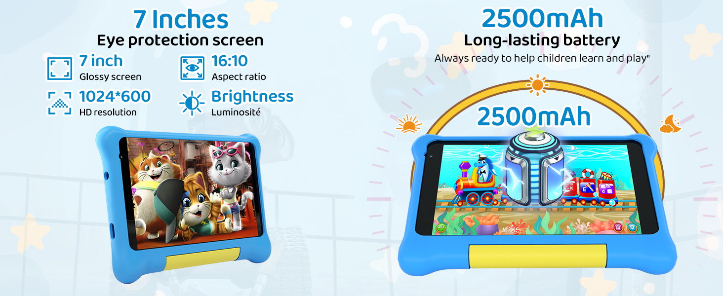 - 【1024*600 IPS Comfortable Eye Protection Display】This 7-inch IPS eye protection tablet for kids is specially designed for children, equipped with a 1024 × 600 high-definition resolution display screen and a 178 ° wide viewing angle to present vivid images. The intelligent quadruple eye protection system provides comprehensive protection for children's visual health through automatic light adjustment, professional blue light filtering, anti glare coating, and intelligent eye reminders. Whether it's online classes, reading picture books, or watching animations, you can enjoy a clear, comfortable, and long-lasting visual experience.
