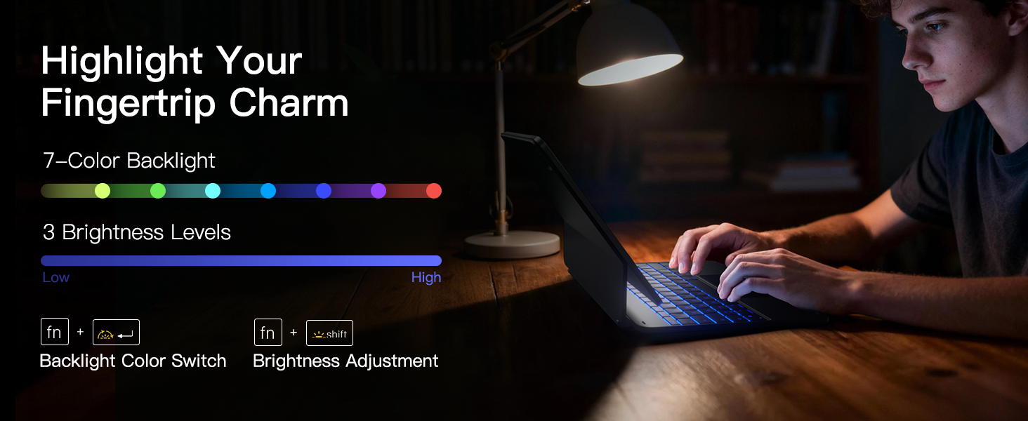 - 7-Color Backlighting: The 7 RGB-colored keys ensure comfortable and efficient work even in low light. Standby time is up to 180 days. With the Inateck Origin App, you can seamlessly dim the brightness in 7 colors and customize the sleep mode individually to maximize your iPad's performance