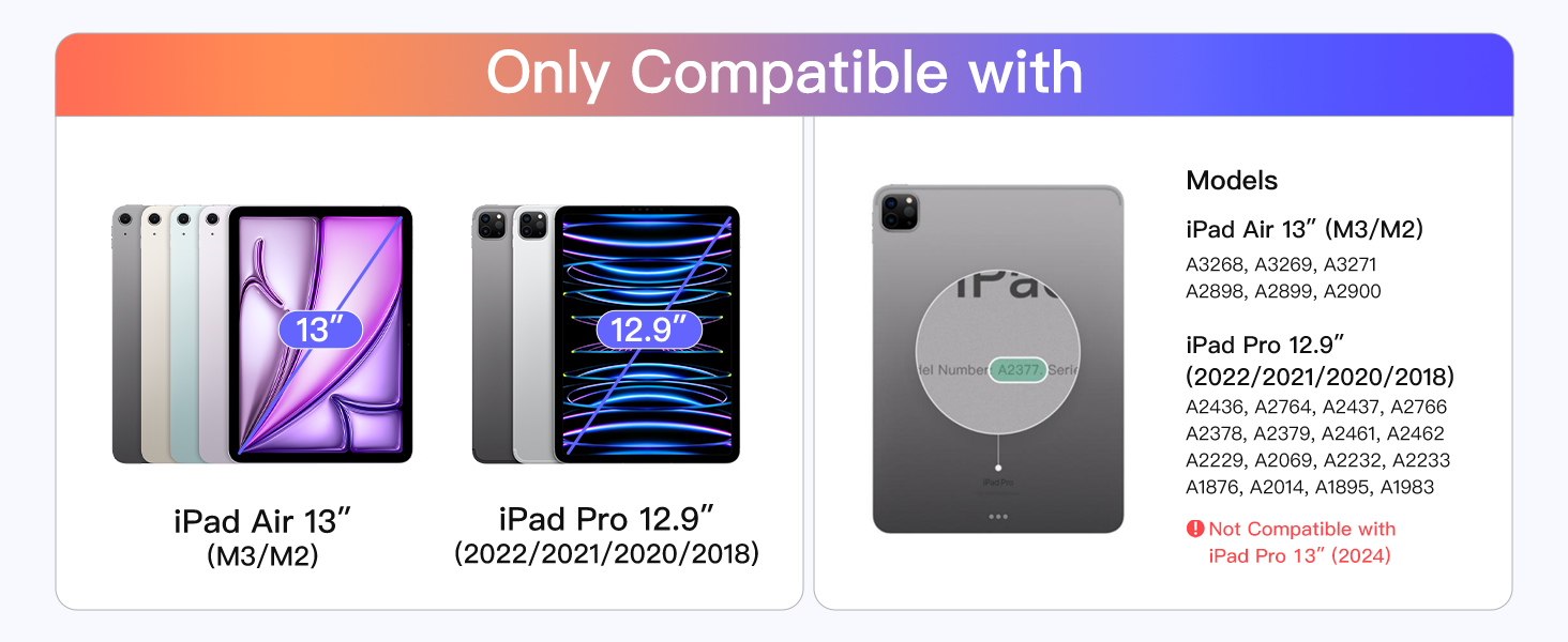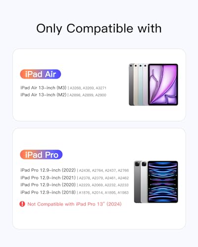 - Compatibility: Specifically designed for iPad Air 13-inch (M3/M2, 2025/2024), iPad Pro 12.9-inch 6th/5th/4th/3rd Gen. Compatible with the following model numbers: iPad Pro 12.9 6th Gen (A2436/A2764/A2437/A2766), iPad Pro 12.9 5th Gen 2021 (A2378/A2379/A2461/A2462), iPad Pro 12.9 4th Gen 2020 (A2229/A2069/A2232/A2233), iPad Pro 12.9 3rd Gen 2018 (A1876/A2014/A1895/A1983)