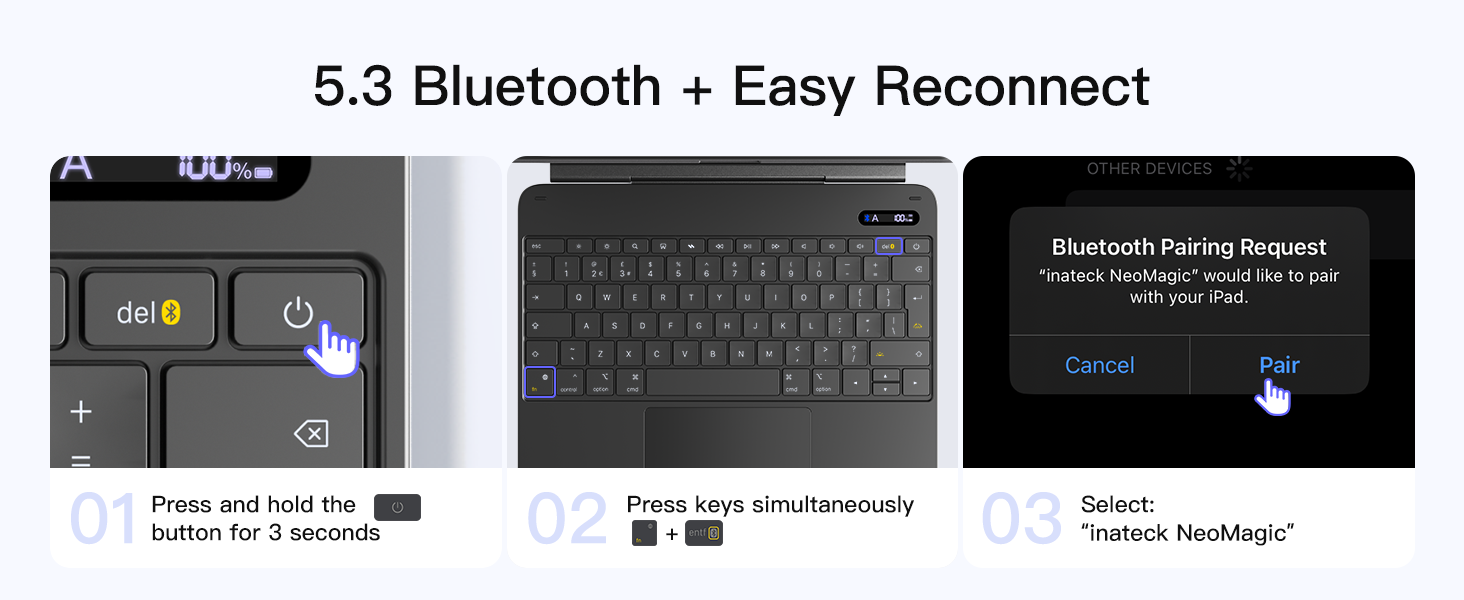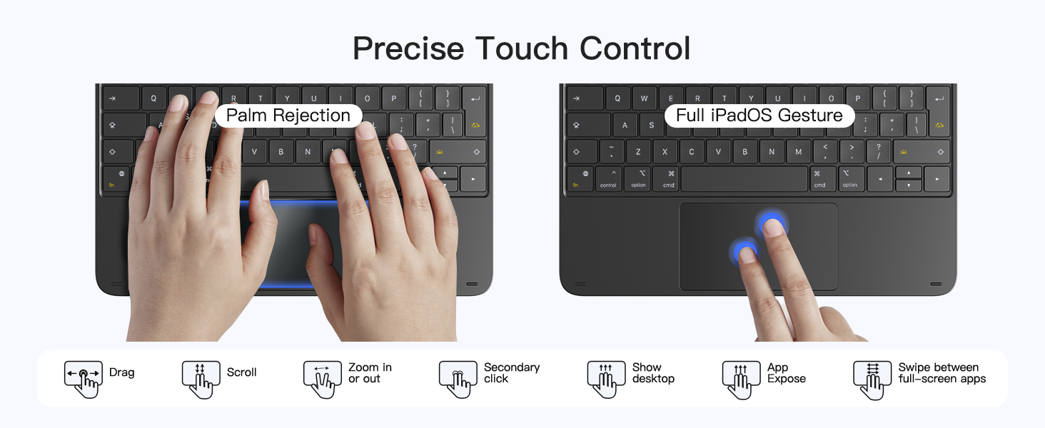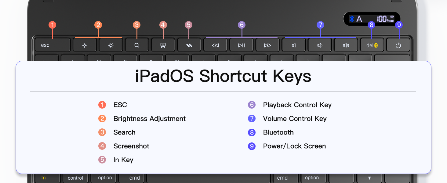 - Customizable Keyboard: Create your personalized experience: Press the "On" key to activate Siri. With the Inateck Origin App, you can use custom touch gestures and 7-color app dimming to maximize your iPad's efficiency
