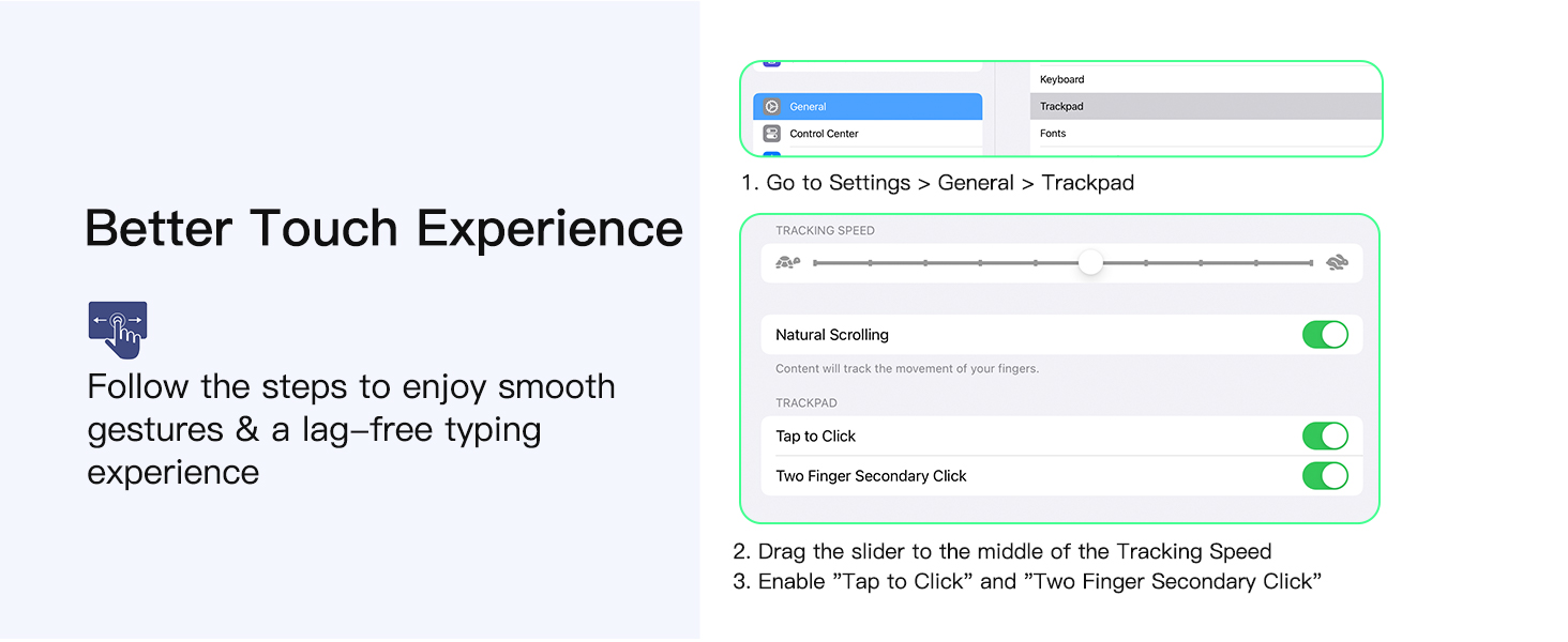- Preparation: Follow these steps to make your trackpad more efficient: Go to Settings > General > Trackpad, move the slider to the middle for pointer speed, and enable "Tap to Click" and "Secondary Click with Two Fingers."