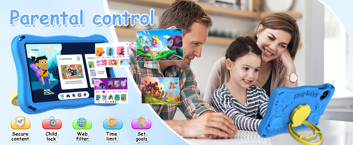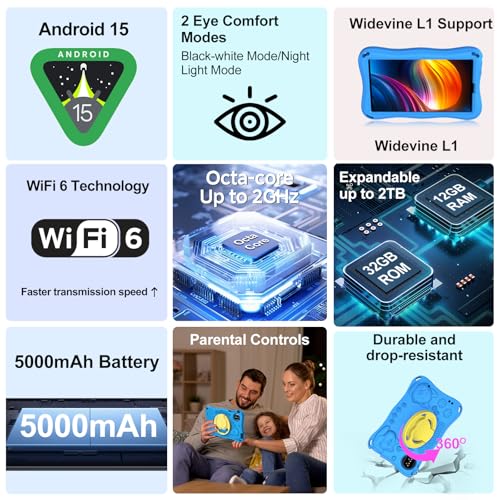- 【Parental Controls + Eye Protection Mode】: This Android 15 tablet features parental controls that allow you to set time limits, content filters, and app permissions. In addition, it has a high-quality single speaker that effectively regulates maximum volume, prevents excessive sound pressure that may be caused by dual speakers, and provides additional protection for ear health. The 9-inch display has an eye protection mode that filters blue light and adjusts the color temperature, reducing eye strain during prolonged use.