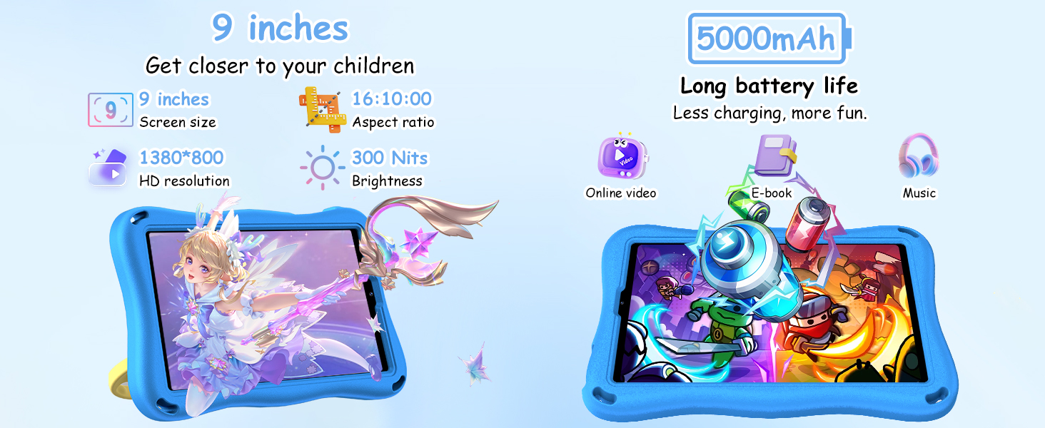 - 【Widevine L1 + Wi-Fi 2.4/5G + Bluetooth 5.0】This 9-inch tablet features an IPS HD display with vivid colors and detailed images. Widevine L1 certification ensures smooth HD video playback for an ideal viewing experience. In addition, dual-band support for 2.4G/5G Wi-Fi improves capacity, reduces latency, and increases network speed stability.