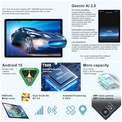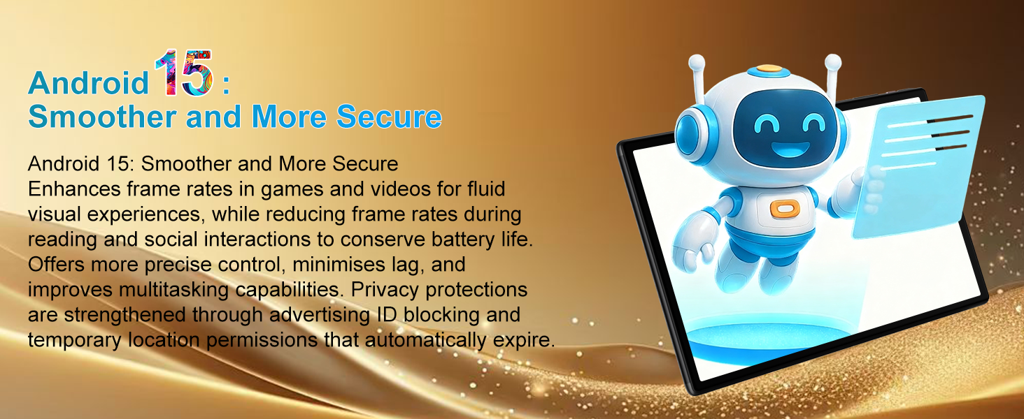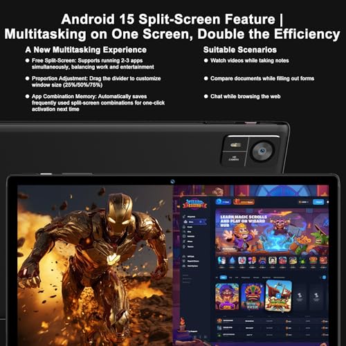 - 【Latest Android 15 System】The tablet is equipped with the latest Android 15 system, which is fast and offers great compatibility. The system fully protects users' privacy. You can customize desktop themes, text styles and App icons, and add widgets like clock, weather and calendar. Android 15 brings you new features such as multi-user, multi-window, split screen and parental control.