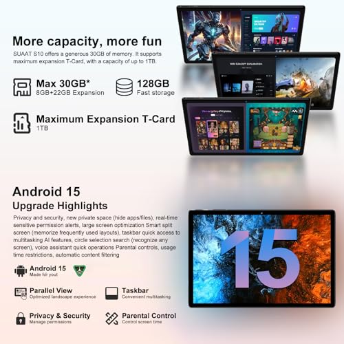 - 【Powerful Tablet 30GB RAM+128GB ROM + 2GHz Processors】The S10 tablet comes with 30GB RAM (8GB RAM + 22GB RAM expansion) and 128GB ROM with support for SD card expansion up to 1TB. The ultra-large RAM offers plenty of space for running applications, downloading and storing photos, movies and games. Combined with a high-speed 2.0 GHz processor, the tablet can smoothly perform tasks such as gaming, office automation and audio.