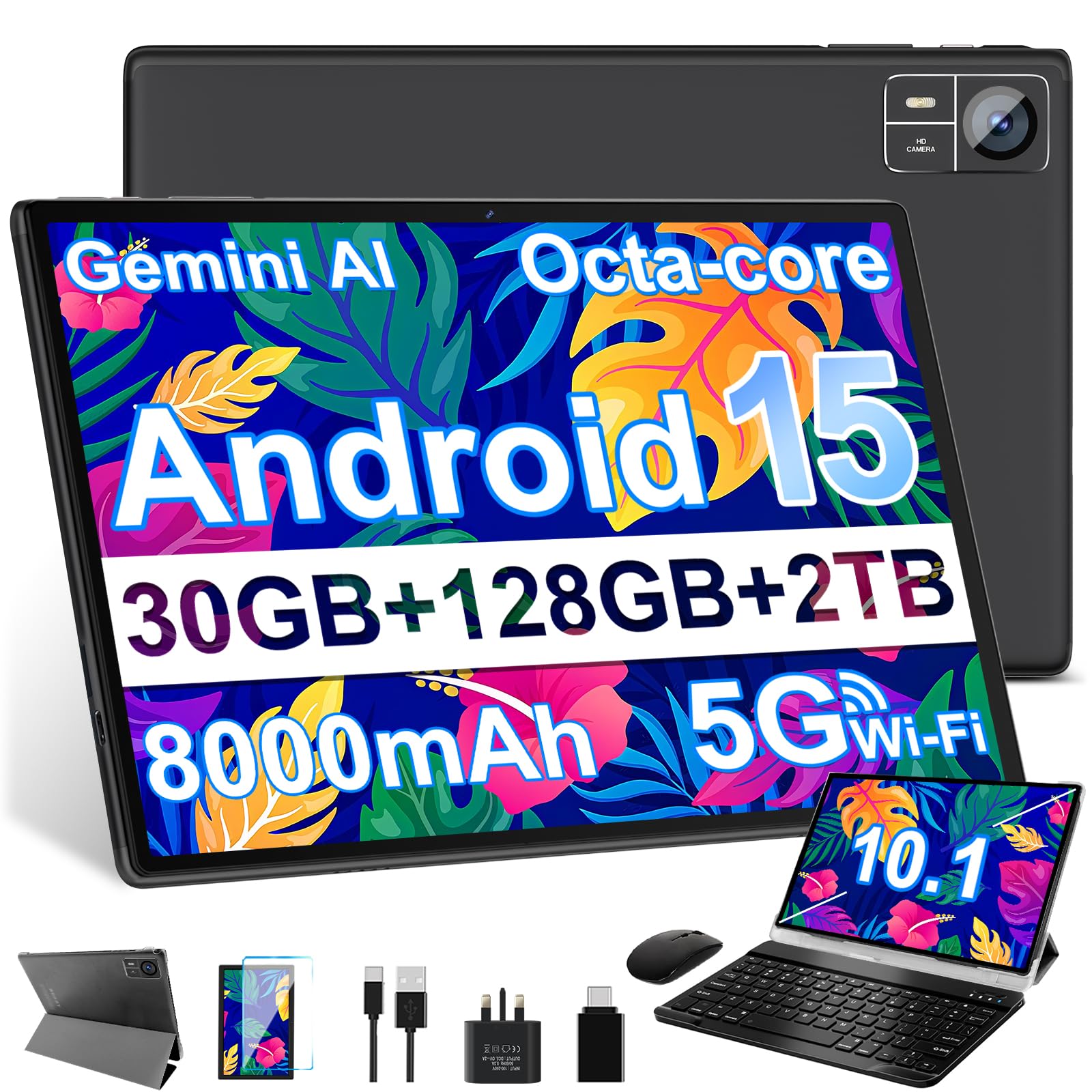 Tablet 10 Inch Android 15 Octa Core 30GB RAM + 128GB ROM (2TB TF) | 5G + 2.4G WiFi | 8000mAh | FHD | Bluetooth 5.0 | GPS | 8MP + 5MP | Type C, Keyboard and Mouse – Black