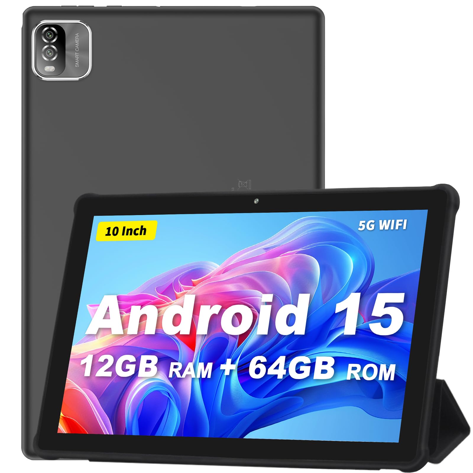 VASOUN 10 Inch Tablet with Case, Tablet PC Android 15 with 12GB(3+9GB Expand) RAM 64GB ROM,6000mAh Battery,1280 * 800 IPS,Dual Speaker,Dual Cameras,Type C(Black)