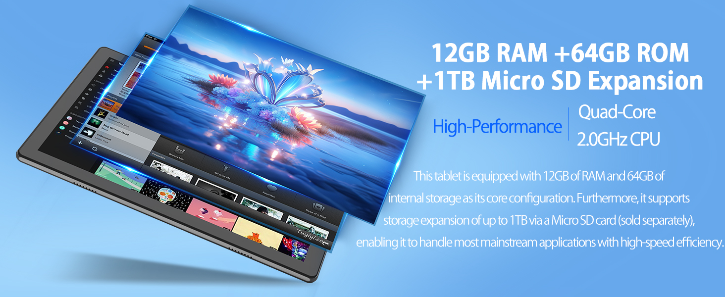 - 【Good Performance&Expandable Storage】Our android tablet is powered by a stable Quad-Core RK3562 processor clocked up to 1.8GHz. This enables faster app launches, smoother video playback, and overall superior performance. With 12GB(3+9GB Expand) of RAM and 64GB of internal storage (expandable up to 1TB with a TF card,do not included), you can run apps seamlessly and store an extensive collection of files, songs, pictures, videos, and games