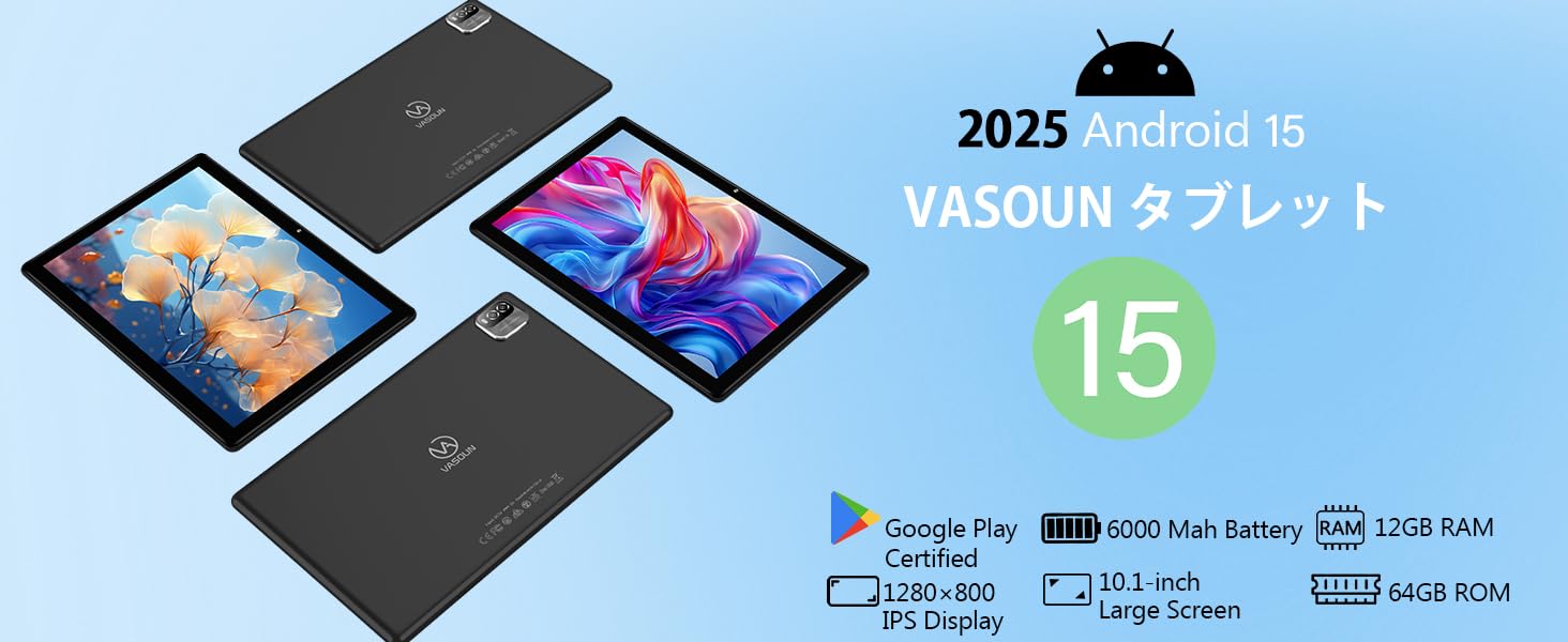 VASOUN 10 Inch Tablet with Case, Tablet PC Android 15 with 12GB(3+9GB Expand) RAM 64GB ROM,6000mAh Battery,1280 * 800 IPS,Dual Speaker,Dual Cameras,Type C(Black)