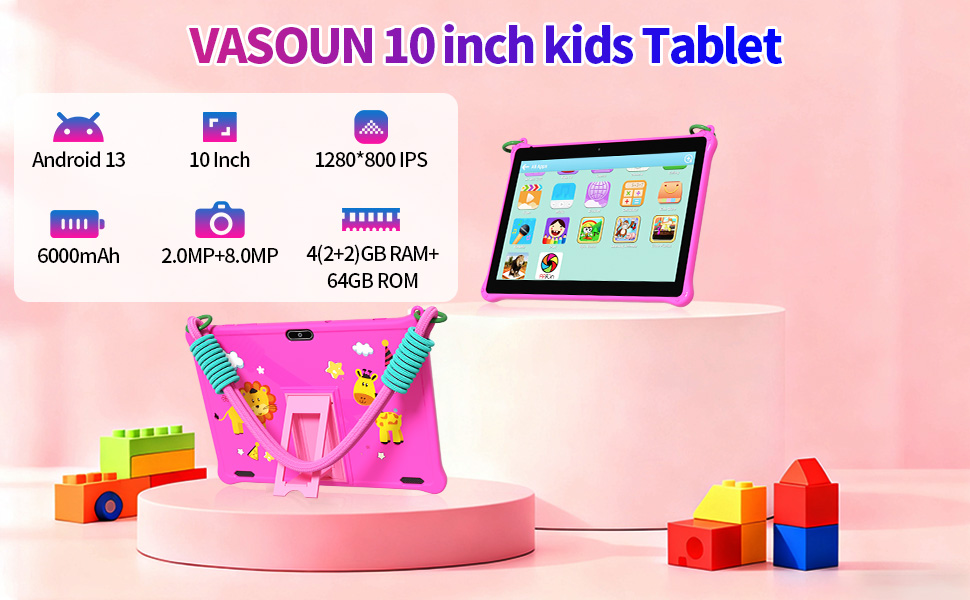 - 2025 10 inch Kids Tablet: Vasoun tablet for kids 10" LCD screen with a resolution of 1280×800 IPS ensures high-quality visuals, making it perfect for children’s viewing pleasure. Let your child explore the world of learning and entertainment with this vibrant and engaging kids tablets.