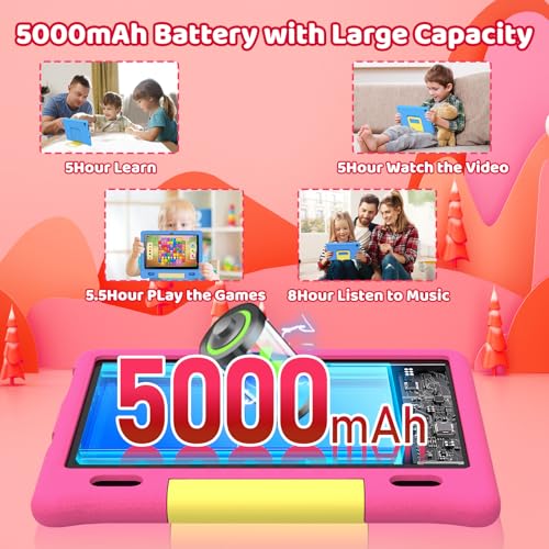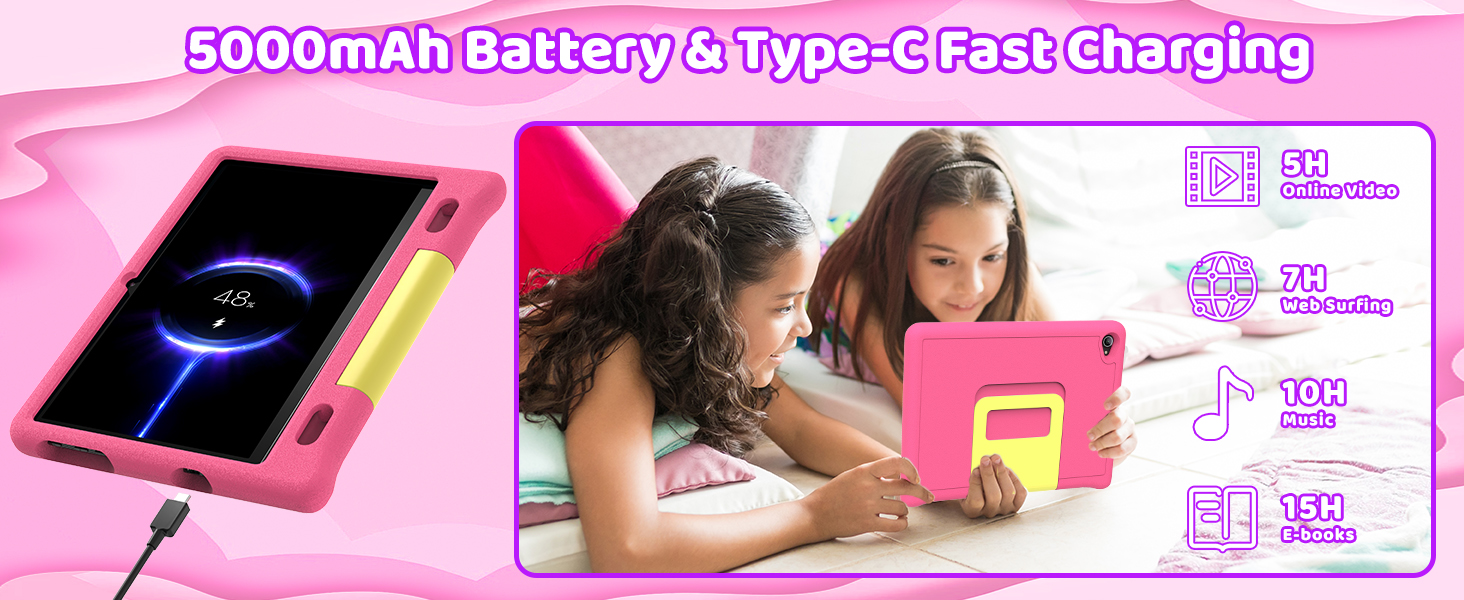 - 【5000mAh Durable Battery & Type-C Fast Charging】The android 15 tablet for kids is designed for beginners and gamers, equipped with a durable 5000mAh polymer lithium battery that can be used continuously for up to 6 hours (for streaming, educational applications, drawing, or gaming). The android 15 tablet is equipped with a USB Type-C port for fast and convenient charging, ensuring that the tablet always provides power for the child's next activity without waiting any longer.