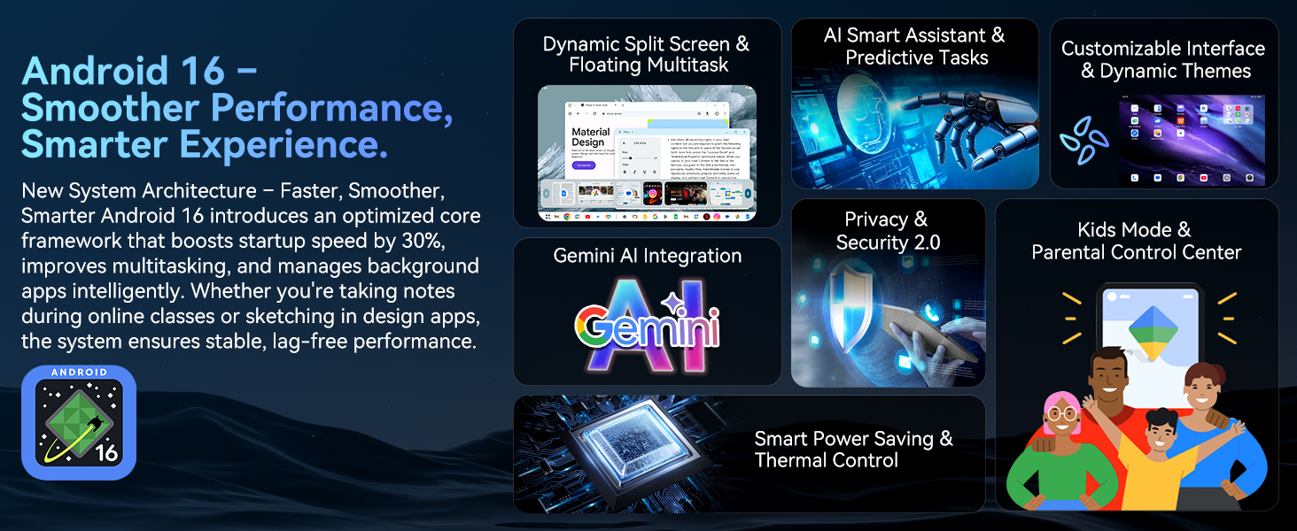 - [Gemini AI 2.0 Android Tablet & Octa-Core Power] Enjoy smooth power for demanding apps and games. Experience responsive gameplay and rich graphics in your favorite titles. The intelligent Gemini AI 2.0 helps manage performance efficiently, while the octa-core chip provides the power you need for a consistently smooth experience