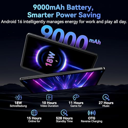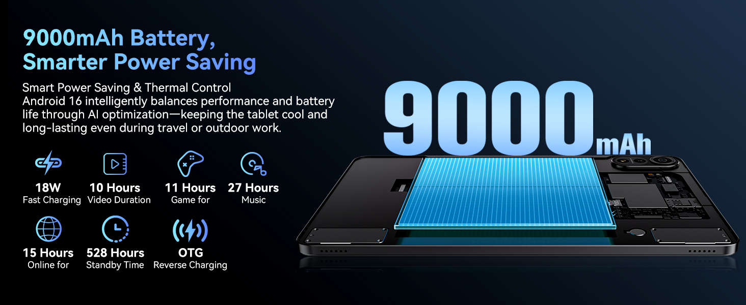 - [All-Day 9000mAh Battery with AI Efficiency] Its battery life lasts all day, and then some. Binge-watch your favorite series from takeoff to landing and still have power to spare. The large 9000mAh battery, intelligently managed to conserve energy, means you can rely on it through long days without constantly hunting for an outlet