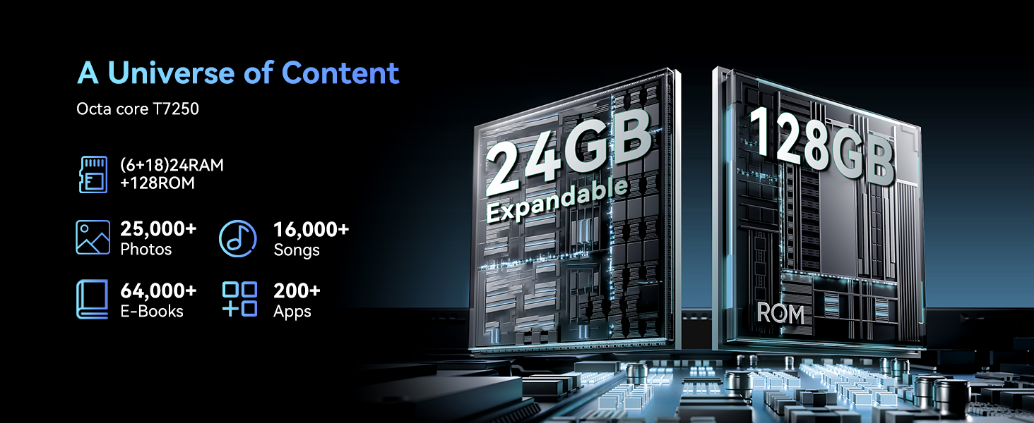 - [24GB RAM & 128GB Expandable Storage] You'll have plenty of space for your photos, files, and more. Never feel pressured to delete precious photos or documents. Start with ample 128GB storage, expand it further with a microSD card for thousands of high-res images, and enjoy smooth multitasking with 6GB of RAM for editing and browsing without slowdowns.Tips:24GB RAM-Expand RAM in Settings