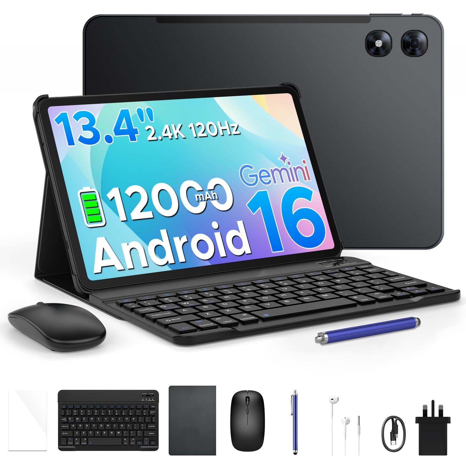 P13 Pro 13.4 inch Tablet, 48GB RAM+256GB ROM, 2.4K 120Hz Android 16 Tablet with Gemini AI, T7280 Octa-Core, 16MP + 8MP, 12000mAh, 5G WIFI, 4G LTE, 3.5mm Headphone, Keyboard, Case-Black
