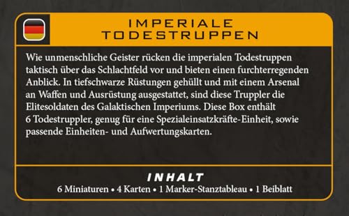 - Six hard-plastic miniatures, including 1 Leader, 1 DT-F16 Heavy Trooper, 1 SLT-19D Heavy Trooper and 3 Death Troopers.